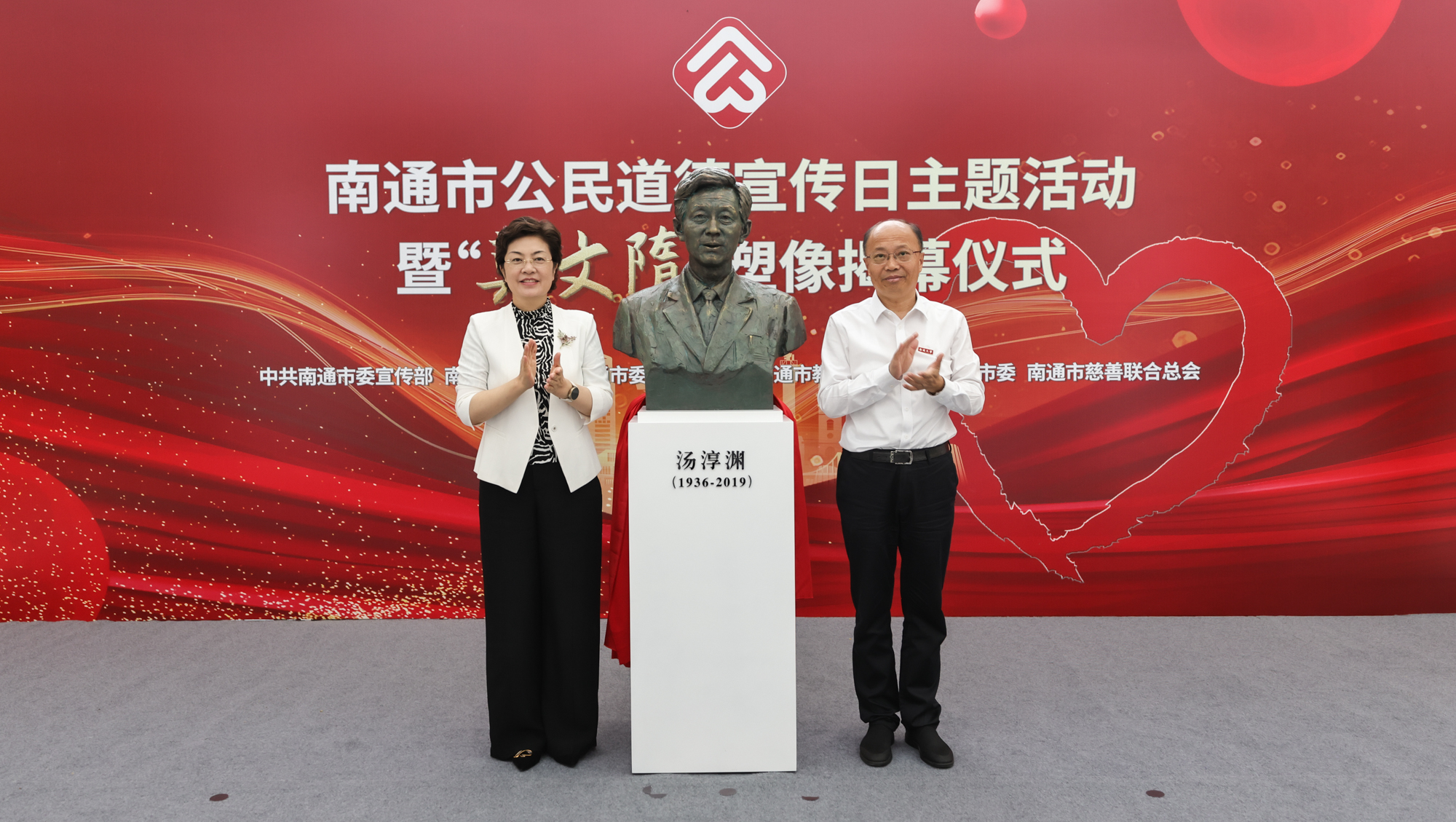 南通市委常委、宣传部部长陈冬梅,南通大学党委书记杨宇民共同为全国精神文明建设典型“莫文隋”原型汤淳渊塑像揭幕。
